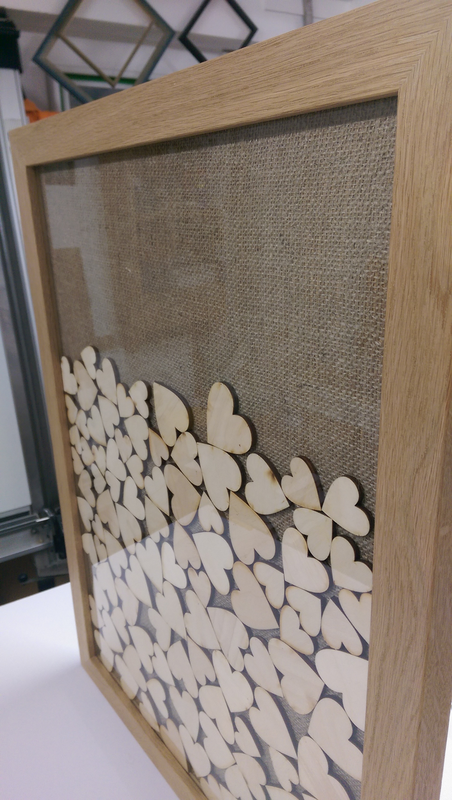 Heart Drop Guest book Frame for your loved ones to sign. Frame is made from 1.5" Solid Oak and finished with wax to protect and bring out the grain in the wood. The backing is Hessian in the sample to the left which gives a great rustic look and makes the hearts stand out.
